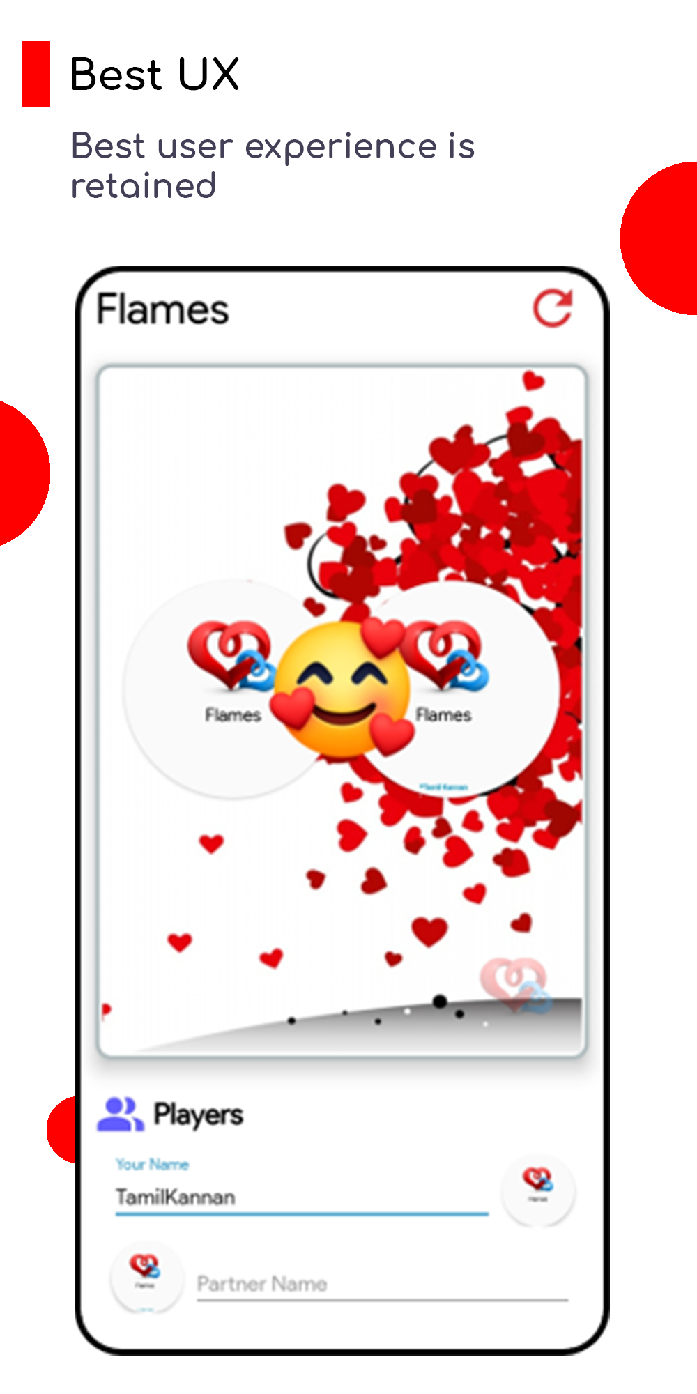 - Enter your partner name as well Flames will automatically show an analytic result about your relationship